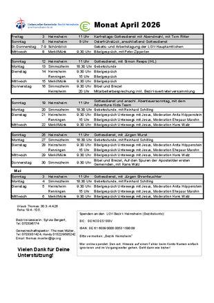 Als Gemeinden und als Bezirk finanzieren wir unsere Arbeit, die Einrichtungen und Angestellten ausschließlich durch freiwillige Spenden. Wir sind zur Förderung gemeinnütziger und kirchlicher Zwecke steuerlich anerkannt und senden Ihnen am Jahresende gerne eine Spendenbescheinigung zu.