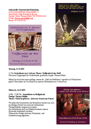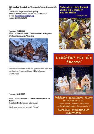 20.00 Uhr Zamma sei - Austausch über die Sonntagspredigt bei Familie Schwarz, Graf-Eberhard-Str. 26 (bzw wie in der aktuellen Wochenübersicht angegeben)